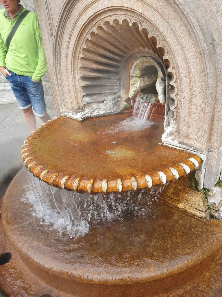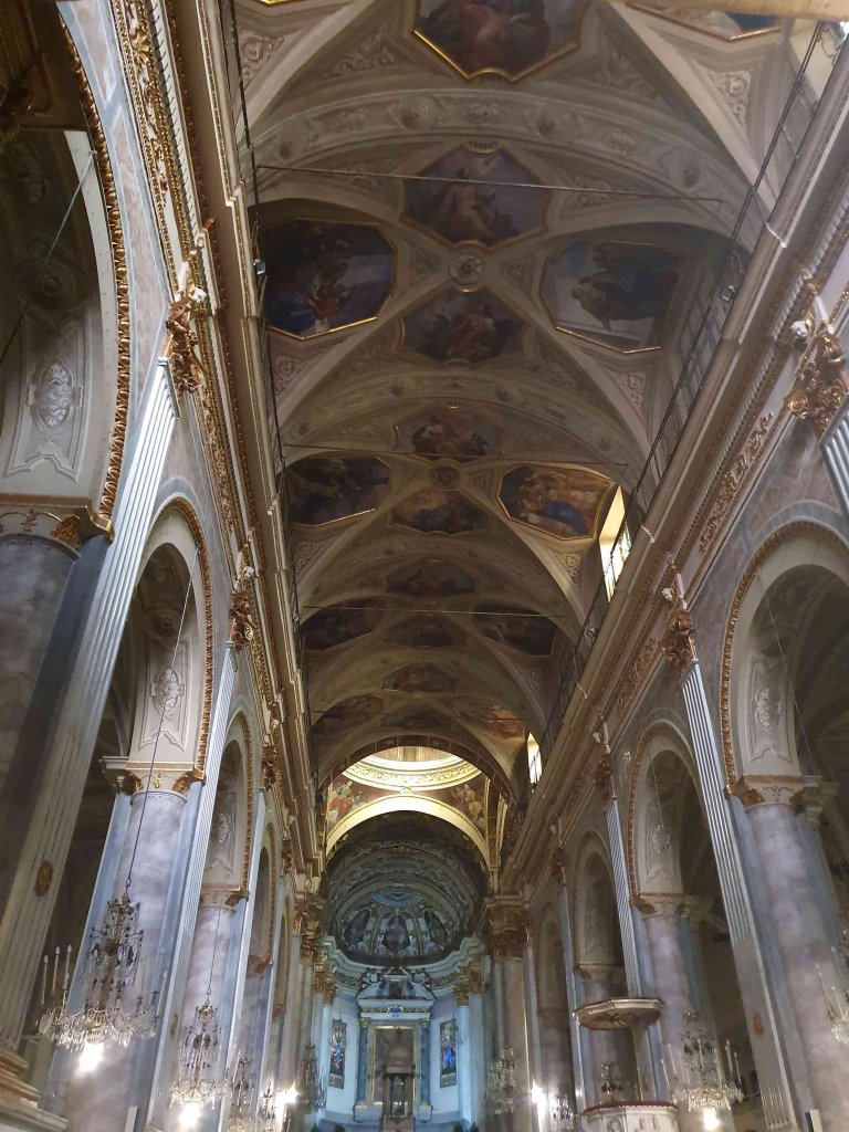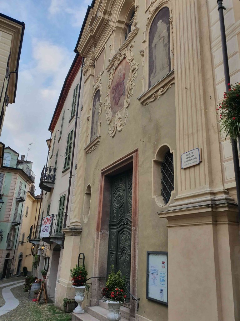 At the Cathedral, dedicated to the assumption of Mary, we were lucky enough to get to see the intact “Trittico Di Acqui.” The exterior shows the annunciation in monochromes. The tryptich is opens like a cabinet to reveal the large central panel painted about 1485 by Spanish painter, Bartolome Bermejo (Rubeus). The Virgin, Mary is holding the Infant Jesus. There’s the portrait of the kneeling donor, Francisco Della Chiesa, and a bird on a string that Jesus is holding.